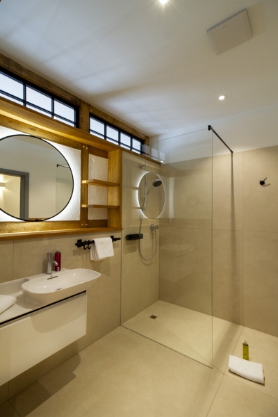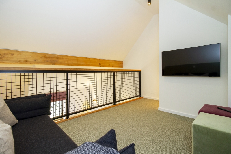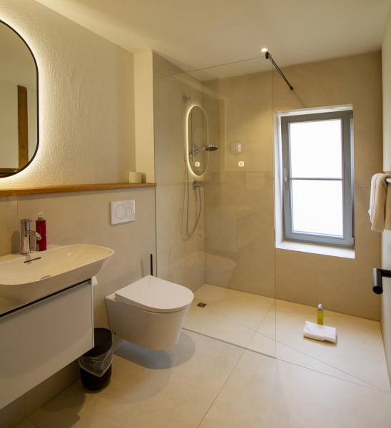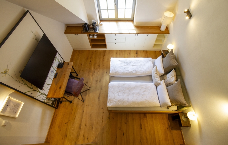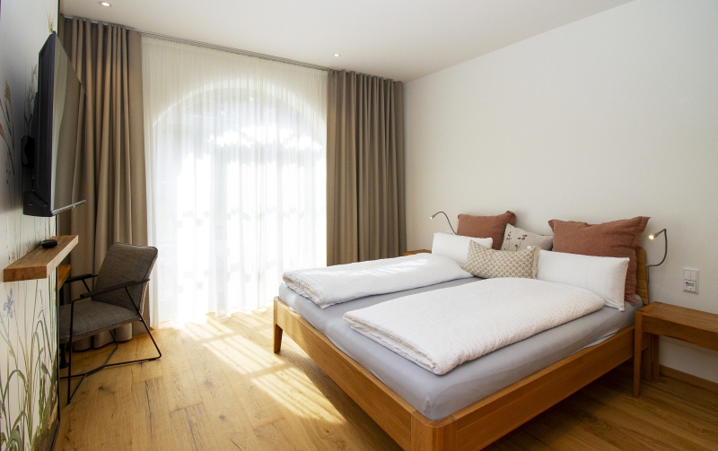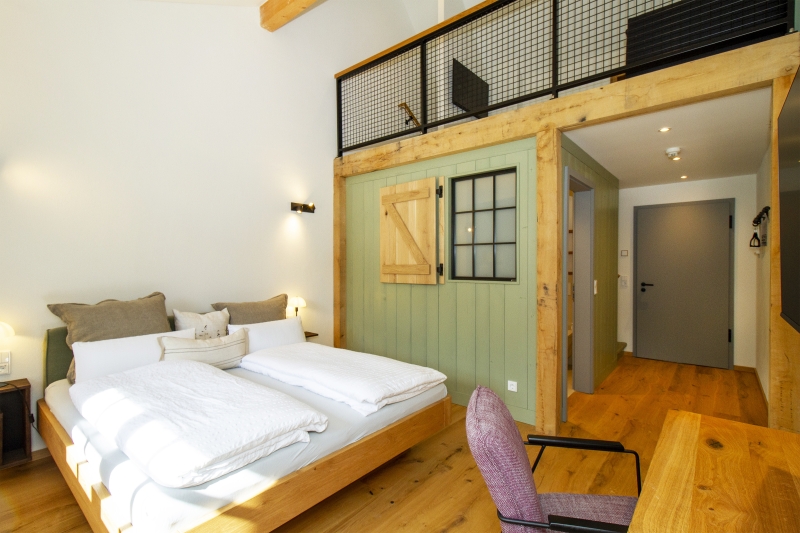 Die neue „Scheune“ ist dagegen vorrangig an Ansprüchen von Urlaubsgästen orientiert. Sie bietet beispielsweise Zimmer mit versteckbaren Doppelstockbetten, die auf Wunsch zum Raum für die ganze Familie gestaltet werden können. Im Erdgeschoss sind zwei barrierefreie Räume zum Repertoire hinzugekommen. Alle Zimmer verfügen über Außenflächen in Form von Balkon oder Terrasse.