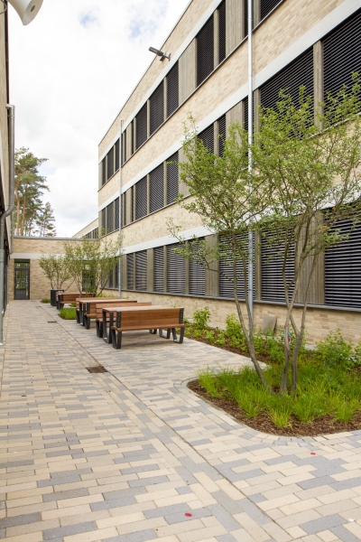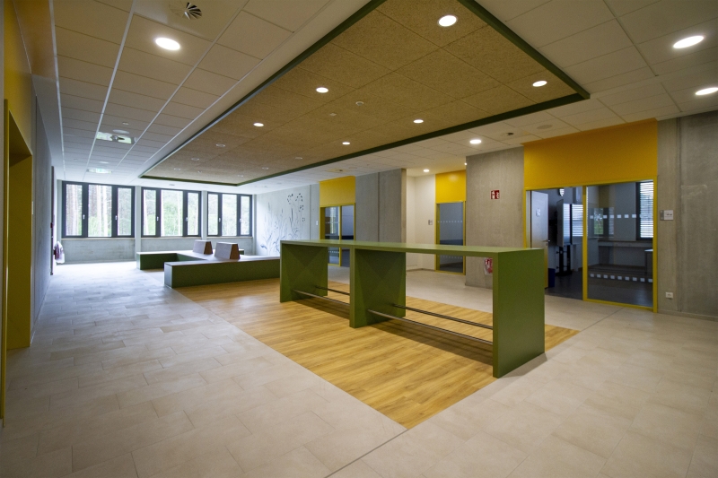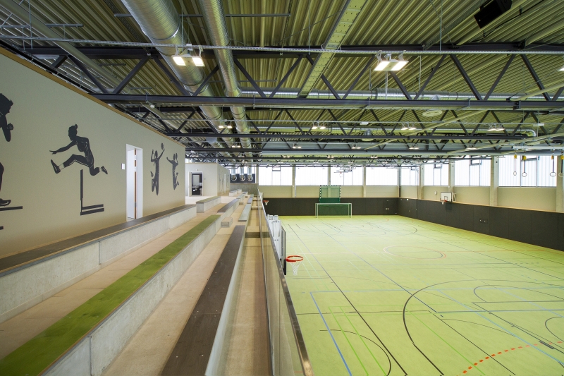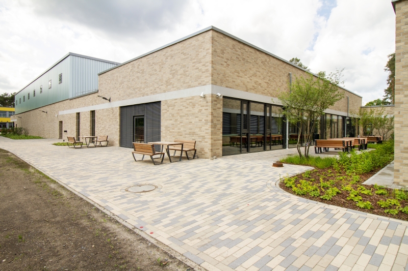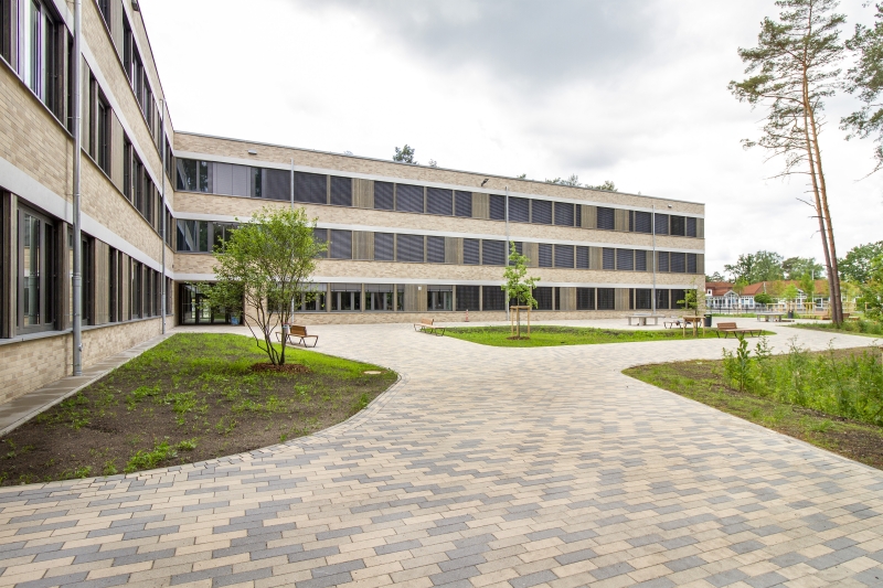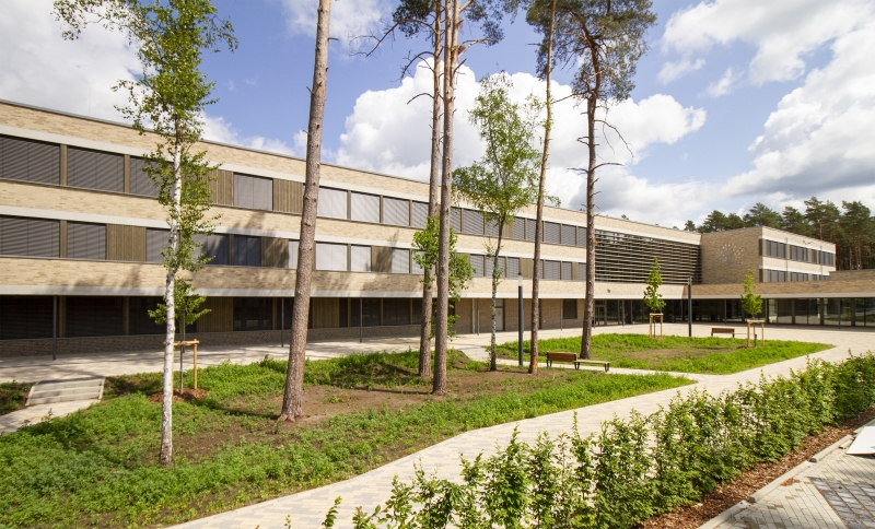 Ergänzt wurde der Bestand durch ein neues Schulgebäude, mit Mensa und Zweifeldsporthalle mit ca. 11.000 qm Nutzfläche. Die großzügigen Außenanlagen beherbergen mehrere Schulhofbereiche für die einzelnen Cluster. An dieser Stelle kommt der Wald ins Spiel, denn das Gebäudeensemble schafft mit seinen natürlichen Fassadenmaterialien nicht nur ein einladend zusammenhängendes Erscheinungsbild, sondern ist auch perfekt in seine baumbestandene Umgebung integriert und präsentiert sich als Schule mit Nähe und engem Bezug zur Natur. Auch der Wald selbst ist einbezogen. Er ist über neu angelegte Pfade erschlossen und bietet mit Trimm-Dich-Pfad und Barfußweg einen ganz besonderen Ort im Freien.