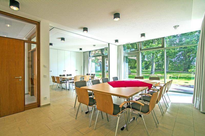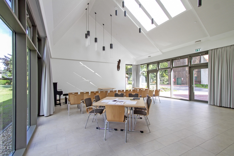Neben dem Gemeindesaal beherbergt das Gebäude zwei Besprechungsräume, ein Foyer und die sanitären Räumlichkeiten. Integriert in den Gemeindesaal ist eine Ausgabeküche, um Veranstaltungen auch den passenden kulinarischen Rahmen geben zu können.