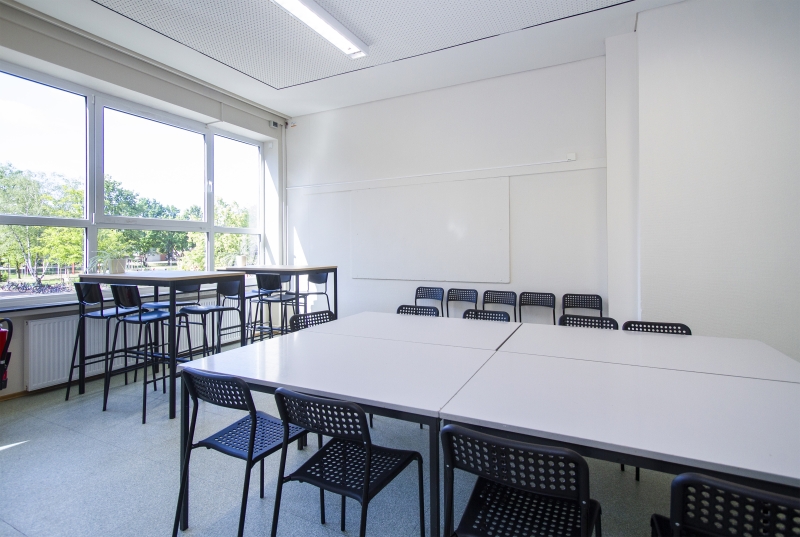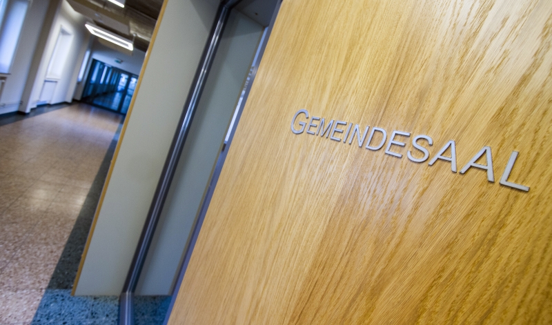 Die vorhandene Klassenzimmerstruktur wird grundsätzlich beibehalten, sodass ein Großteil der Arbeiten nicht der innenarchitektonischen Umgestaltung, sondern der gebäudetechnischen Erneuerung gewidmet ist. Eine auffällige Ausnahme ist der neu geschaffene Gemeindesaal im ersten Obergeschoss, ein repräsentativer Raum mit Bühne, Präsentationstechnik und Parkettboden, der rund 100 Personen Platz bietet.