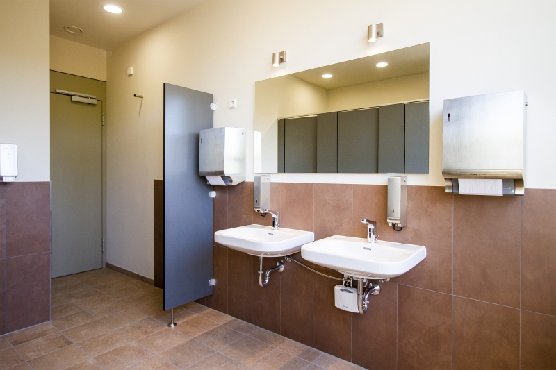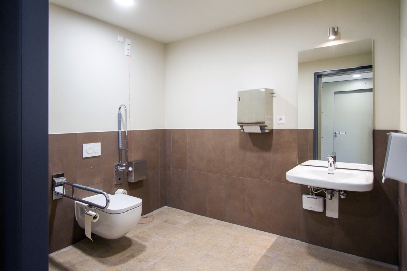 Neben der Elektrik, Netzwerktechnik und Beleuchtung wurde auch der Sanitärbereich grunderneuert und in der ersten Etage gebündelt untergebracht. Zusätzlich zu den Toiletten für Damen und Herren findet sich hier auch ein WC, das barrierefrei genutzt werden kann. Für den barrierefreien Zugang zu sämtlichen Räumen des Bürgerhauses sorgt die außen installierte Aufzuganlage.