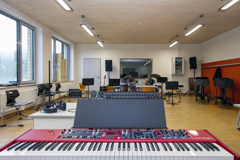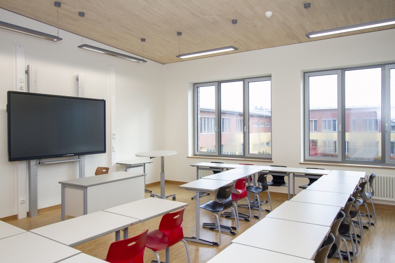Hochwertig ist die Innenausstattung, die dafür sorgt, dass hier statt rein funktionaler Schulräume eine Lernlandschaft mit viel Ambiente entstanden ist – eine Einladung an Schülerinnen und Schüler, sich ihren Fächern und Aufgaben mit Freude zu widmen. Die Fußböden beispielsweise sind mit Ausnahme der Flure als Parkett ausgeführt, im Obergeschoss schließen die hohen Räume mit einer Brettsperrholz-Kastendecke ab, deren geschlossene, anspruchsvolle Holzuntersicht für eine optische Einheitlichkeit im Erdgeschoss wieder aufgegriffen wurde.