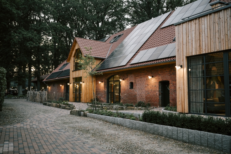 Im Mittelpunkt der Umbaumaßnahme steht eine alte Scheune, die zum historischen Bestand des traditionellen Bauernhofs gehört, in dem Familie Averbeck einst ihren Traum vom eigenen Hotelbetrieb wahr machte. Wobei „Umbau“ im Fall dieser Scheune ein Begriff ist, der fast ein bisschen zu kurz springt. Denn die Substanz des altehrwürdigen Bauwerks ließ keine andere Möglichkeit, als das Gebäude komplett zu entkernen, die Balkenkonstruktion des Dachstuhls abzutragen und gewissermaßen ein neues Gebäude in Holzständerkonstruktion in die Hülle des alten hineinzubauen.