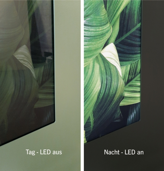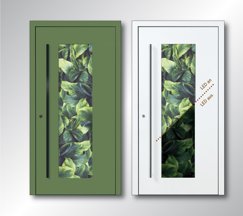 Zusätzlich hat der Hersteller eine Haustür mit Glasdruck im Repertoire, die ein authentisches Blättermotiv besitzt und auf Wunsch sowohl auf der Außen- als auch auf der Türeninnenseite sichtbar ist. Das Urban-Jungle-Design besitzt eine brillante Optik und setzt mit seinem lebendigen Farbspiel aus kräftigen und zarten Grüntönen sowie den organischen Formen an jeder Hausfassade ein naturnahes Akzent-Statement. Auch bei dieser Variante betonen die unsichtbar im Scheibenzwischenraum verlaufenden LED-Streifen die harmonischen Formen, lassen Flächen lebendig wirken und schaffen fließende Übergänge zwischen innen und außen. Dank der optionalen Dimmfunktion kann die Lichtintensität ganz nach Stimmung und Bedarf flexibel angepasst werden.