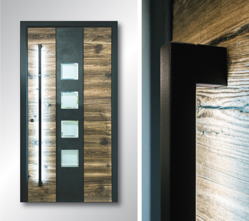 LED-Haustüren setzen Glasmotive in Szene und verwandeln den Eingangsbereich in ein Spiel aus Licht, Schatten und Struktur