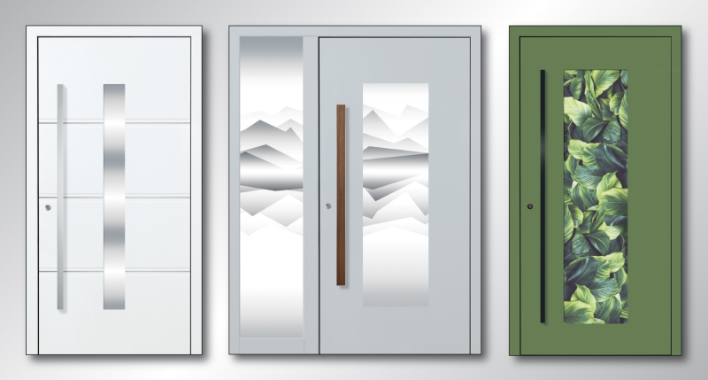 Während die Haustür tagsüber klar und strukturiert wirkt, erwacht mit Einsetzen der Dämmerung ihr voller Charme zum Leben – hier wird Licht zum stimmungsvollen Statement und Glas zum Spiegel von Individualität und Persönlichkeit. Durch moderne Lasertechnik entstehen z. B. aus zahllosen kleinen Punkten mondäne Motive, die für jeden Geschmack das passende Design bereithalten – vom alpin anmutenden Bergpanorama bis hin zum modern-puristischen Streifenlook.
