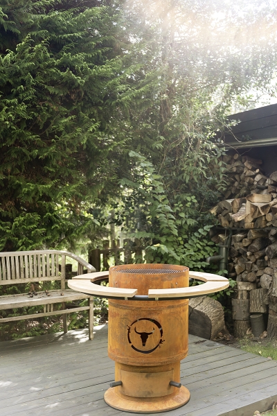 Mit seinem stabilen Standfuß dient das Modell z. B. als Untergestell für die BBQ Disk. Im Nu verwandelt die gusseiserne Platte die Feuertonne in eine Plancha mit unterschiedlichen Temperaturzonen. Baguette aufknuspern, Grillgut warmhalten oder Gemüse rösten – das komplette Essen lässt sich gemeinsam an einem Ort zubereiten. Der an der Front sichtbare Moesta-BBQ Stier sorgt nicht nur für die benötigte Luftzufuhr, sondern erzeugt auch ein atmosphärisches Flackern des Feuers. Den einzigartigen, urigen Look komplettiert der verarbeitete Corten Stahl, der Rost nur an der Oberfläche zulässt.