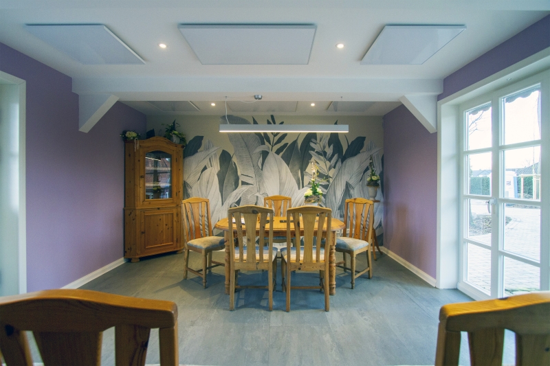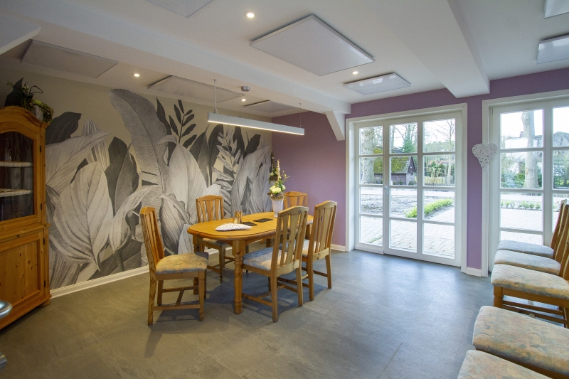 Im Rahmen der Baumaßnahme wurde der Speicher komplett entkernt und mit neuem Fußboden, neuer Decke und entsprechender Dämmung versehen. Ein echtes Highlight der Effizienz ist die Heizung, die als Infrarotanlage ausgeführt ist. Sie bietet den Vorteil, anlassbezogen und sehr kurzfristig für eine einzelne Trauung hochgefahren werden zu können – übrigens auch per App aus der Ferne. So lässt sich in nur etwa zehn Minuten eine angenehme Raumtemperatur erzeugen, die darüber hinaus auf einer wohligen Wärme basiert, wie wir sie von Kaminöfen kennen. Der Clou: Es entstehen dabei pro Trauung lediglich Heizkosten von 1,50 Euro.