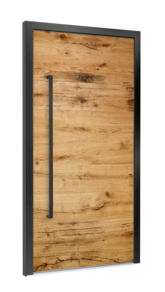 Echte Unikate „made in Germany“ findet man bei der exklusiven Lignum Echtholz-Serie des nordrhein-westfälischen Qualitätsherstellers Rodenberg. Die aus geölter Eiche bestehende Holzoberfläche eignet sich für die Veredelung von Aluminium- und Kunststoffhaustüren. Sie versprüht nicht nur Natur pur, sondern spiegelt den Charakter von rustikalem Altholz in einem angesagten Vintage-Look wider. Die individuellen Maserungen und changierenden Farbnuancen lassen die Eingangspforte lebendig wirken und verleihen dem Haus eine besondere Note. Durch erhabene Glasapplikationen, die Integration von Teilflächen im persönlichen RAL-Wunschfarbton oder eine Kombination mit Ganzglas-Seitenteilen aus mattiertem oder klarem Glas lässt sich der optische Gesamteindruck ganz nach persönlichem Gusto weiter verfeinern. Spannende, designstarke Kontraste zwischen klassischer Natürlichkeit und moderner Eleganz erzielt man, indem Griffelemente und Rosetten bspw. aus Edelstahl oder in Schwarzstahl-Optik RAL 9005 Feinstruktur gewählt werden.