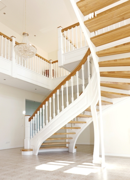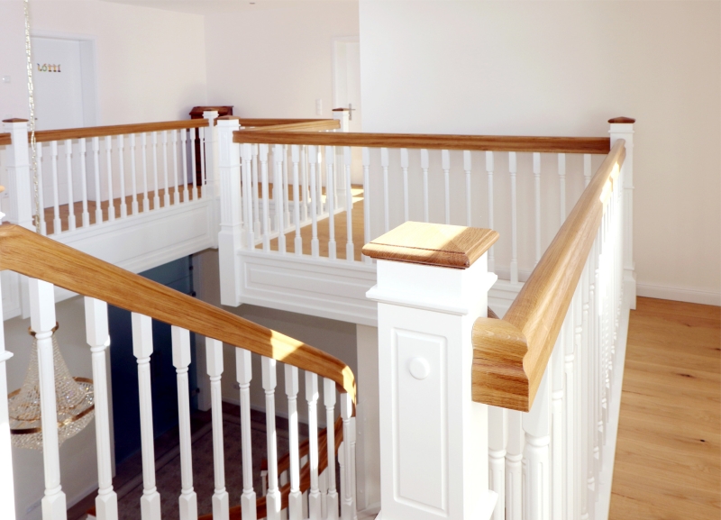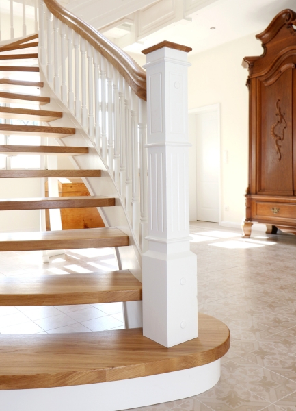 Die Trittstufen, der Handlauf mit praktischer Griffrille und die dekorativen Pfostendächer bestehen aus massivem Eichenholz, dessen Oberfläche gebürstet, geölt und gewachst wurde. Dazu bilden die Wangen, Pfosten und Geländerstäbe sowie die Deckenlochverkleidungen und die formschöne Stütze in der Wendelung – alle aus weiß lackierter Esche gefertigt – einen starken Kontrast, der das edle Ambiente unterstreicht. Absolute Hingucker sind die ausgefrästen Füllungen der Wangen, Pfosten und Deckenlochverkleidungen und die gedrechselten, kannelierten Geländerstäbe. Und auch die Treppenkrümmlinge in der Wendelung, also die gebogenen Verbindungsstücke in Wange und Handlauf, sind gelungene Beispiele für Treppenbaukunst in Perfektion.