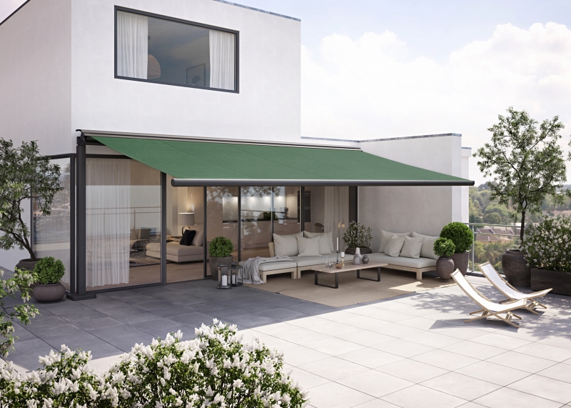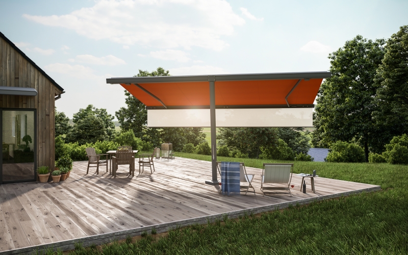 Freistehende Markisensysteme beschatten Terrasse, Garten oder Poolbereich