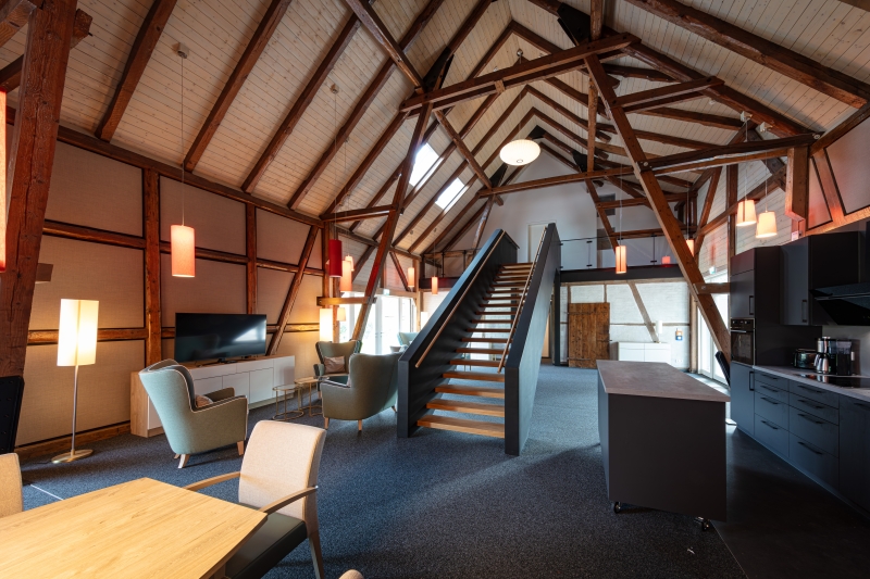 Insgesamt stehen der Senioren-WG zwölf Zimmer zur Verfügung. Vier von ihnen sind im Hauptgebäude untergebracht, in dem sich außerdem ein großzügig dimensionierter Gemeinschaftsraum befindet. Sechs Zimmer gehen vom Flur des Verbindungstrakts ab, zwei weitere beherbergt die Scheune, in der sich der Aufenthaltsraum und außerdem eine Küche für die Bewohnerinnen und Bewohner zur Verfügung steht, die sich selbst versorgen. Das Obergeschoss der Scheune ist als Personalbereich ausgelegt.