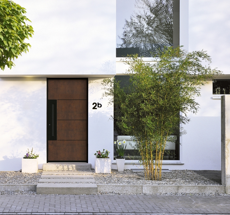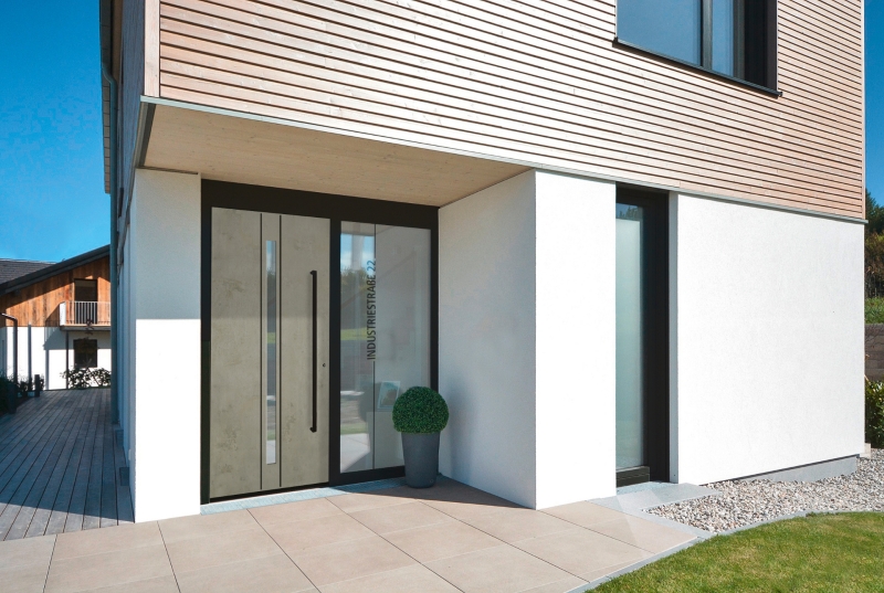 Keramik-Haustürfüllungen im rustikalen Loft-Look werten Eingangsbereich und Hausfassade auf