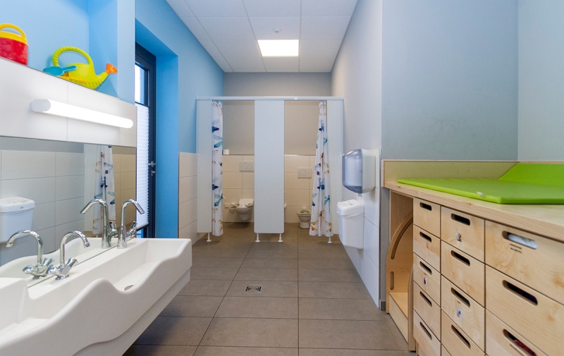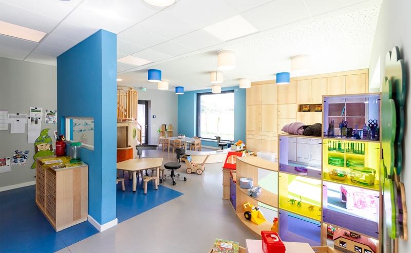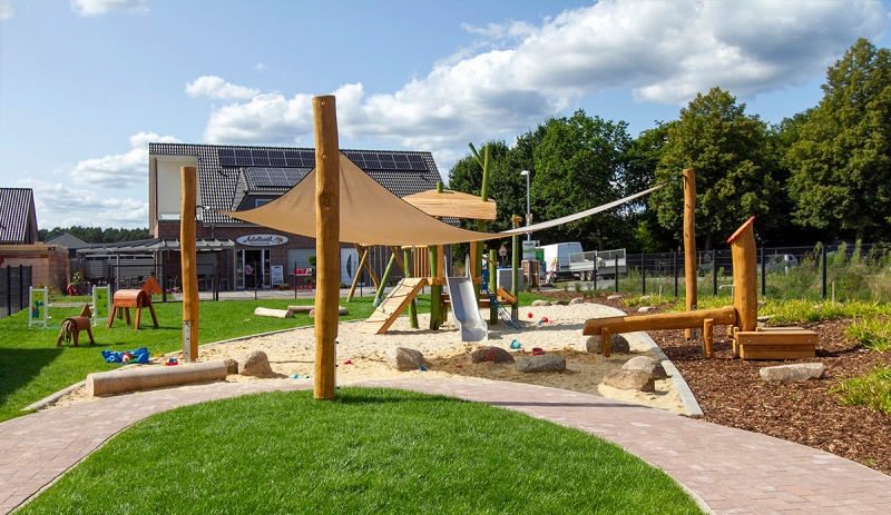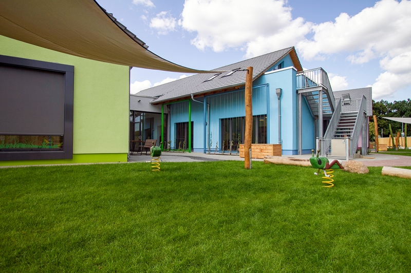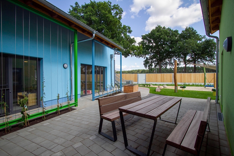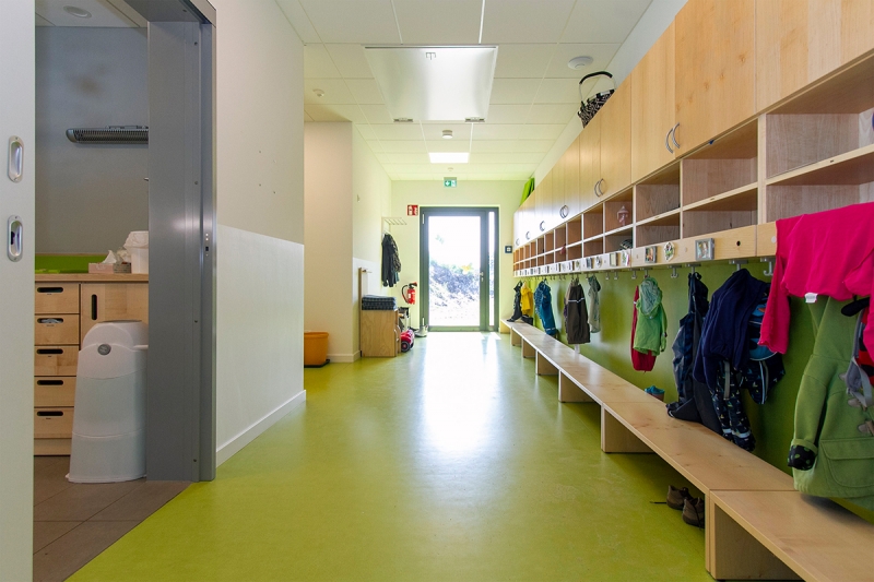 Auf insgesamt 1.038 Quadratmetern Bruttogrundfläche ist hier eine Kindertagesstätte, die sowohl ihre jungen Gäste als auch das Team der Mitarbeitenden mit idealen Bedingungen verwöhnt. Denn selbstverständlich wurden auch die Bedürfnisse der hier tätigen Erwachsenen berücksichtigt, unter anderem durch die Zweigeschossigkeit eines der Gebäude, in dessen Obergeschoss Platz für die Leitung und Verwaltung der Einrichtung zur Verfügung steht.