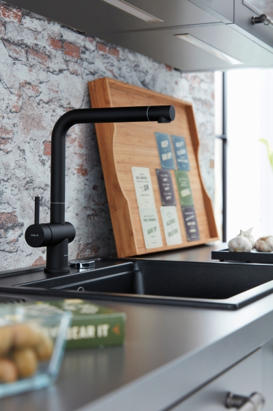 (epr) Schwarz oder Anthrazit sind das „neue Weiß“ in der Küche. Dunkle Fronten, schwarze Armaturen, Spülen, Arbeitsplatten und Griffe, ja, selbst schwarze, graue oder anthrazitfarbene Dunsthauben, Kochfelder und Backöfen sind der Trend schlechthin. Kein Wunder, diese Töne setzen edle, elegante Akzente und verleihen der Küche ein modernes, stylisches Aussehen.