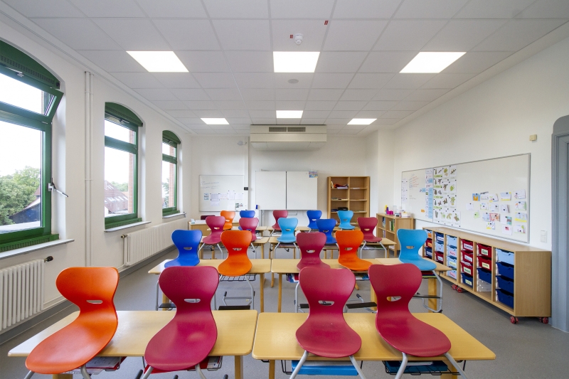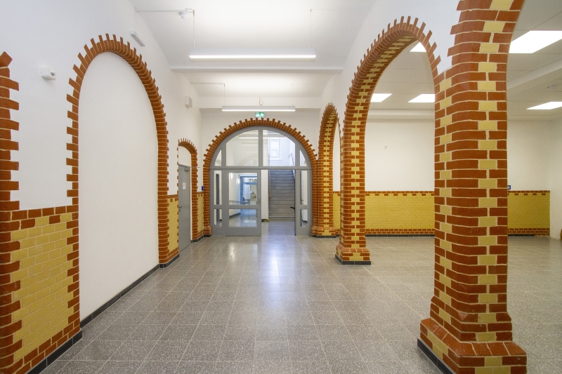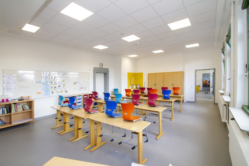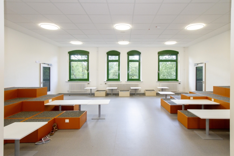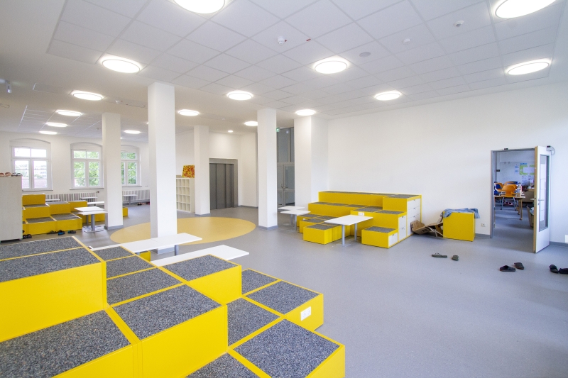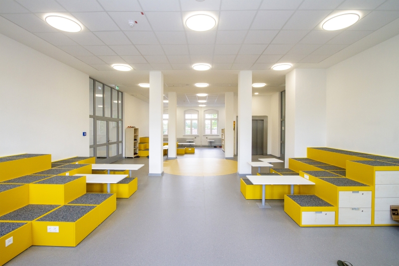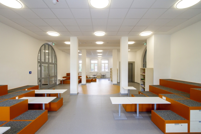 Doch gingen die Umbaumaßnahmen selbstverständlich weit über die Neuanordnung der räumlichen Angebote hinaus. Neben einer umfassenden Ertüchtigung des Gebäudes auf aktuelle Standards des Brandschutzes, wurde auch die Elektrik komplett erneuert. Lernenden und Lehrenden steht hier eine technische Ausstattung auf Höhe der Zeit zur Verfügung, vom Smartboard bis zum Tablet. Auch der Aspekt der Inklusion ist verwirklicht: Zwei neue Aufzüge ermöglichen den barrierefreien Zugang zu allen Räumen der Schule.