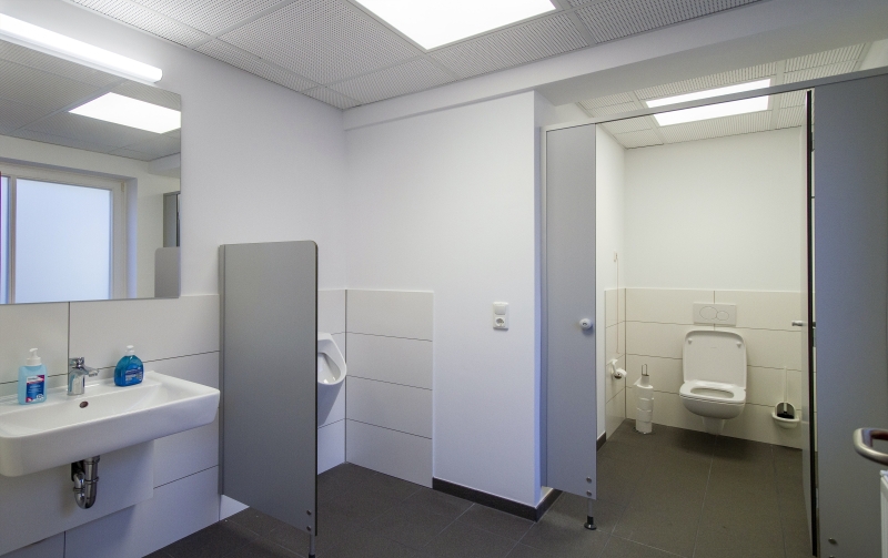 Im Obergeschoss des Gebäudes wurden ebenfalls die Sanitäranlagen saniert und technisch als auch optisch auf einen modernen Stand gebracht. Außerdem nutzte man die Gelegenheit, eine Stahlaußentreppe zu ergänzen, um brandschutztechnisch einen zweiten Fluchtweg und ganz allgemein einen bequemen direkten Zugang zum Kurs- und Versammlungsraum in der ersten Etage zu schaffen.
