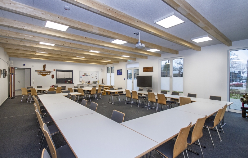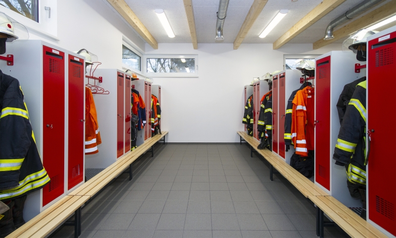Im Feuerwehrhaus sind ein Gruppenraum, ein Raum für die Jugendfeuerwehr, ein Büro und Umkleiden sowie Sanitärbereiche untergebracht. Das Thema „Sicherheit der Einsatzkräfte“ findet sich hier in Form der sogenannten Schwarz-Weiß-Trennung wieder. Damit ist eine Abgrenzung bezeichnet, die den privaten Umkleidebereich (weiß) vom Einsatzbereich (schwarz) trennt, wobei die Sanitärräume als Schleuse dienen. Damit wird zum einen gewährleistet, dass möglicherweise kontaminierte Dienstbekleidung nicht mit den privaten Kleidungsstücken in Kontakt kommt, zum anderen wird so ein klarer Laufweg vorgegeben, der verhindert, dass sich ankommende und ausschwärmende Einsatzkräfte in die Quere kommen.