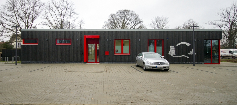 Und dann gibt es da doch noch ein Bauelement, das über das rein Funktionelle hinaus einen besonderen ästhetischen Akzent setzt. Denn die Fassade des Neubaus ist in karbonisiertem Holz ausgeführt. Das sorgt in kontrastreicher Verbindung mit den leuchtend roten Fenstern für eine attraktive Optik. Und es beinhaltet eine charmante Anspielung an das bestimmende Thema dieses Ortes. Denn die Karbonisierung des Holzes wird erzielt, indem man die Bauelemente buchstäblich abfackelt.