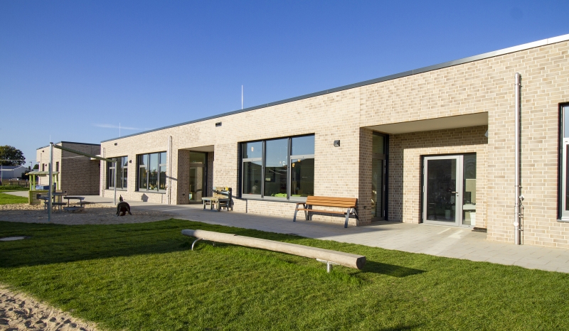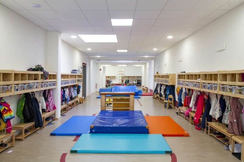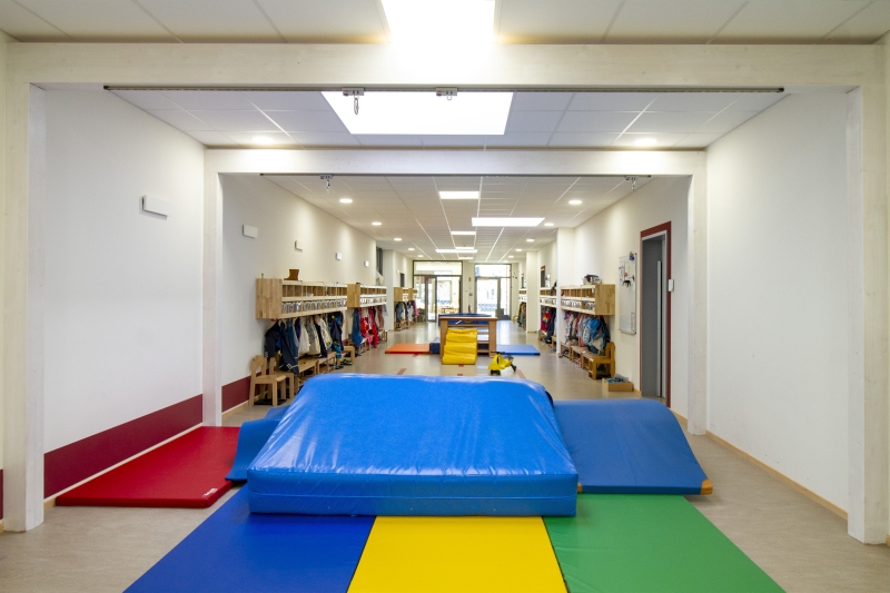 „Die Bewegungshalle ist eine Art Herzstück unserer Kita“, sagt die Leiterin Nicole Schmerse, „in ihr wird unser pädagogisches Konzept zum realen Raum.“ Dass Anspruch und Wirklichkeit hier so gut zusammenpassen, ist auch Verdienst der Kita-Leitung, denn sie war von Tag Eins an bei der Planung beteiligt und konnte in engem Austausch mit der Gemeinde und dem ausführenden Bauunternehmen Goldbeck ihre Wünsche einbringen und ihre Vorstellungen am Ende verwirklichen.