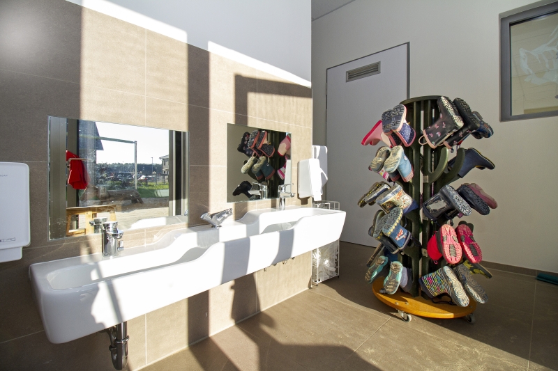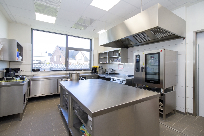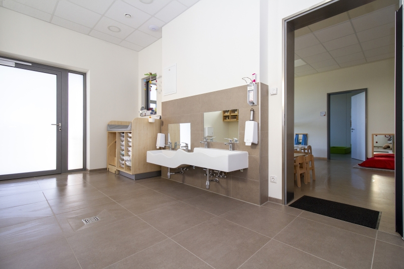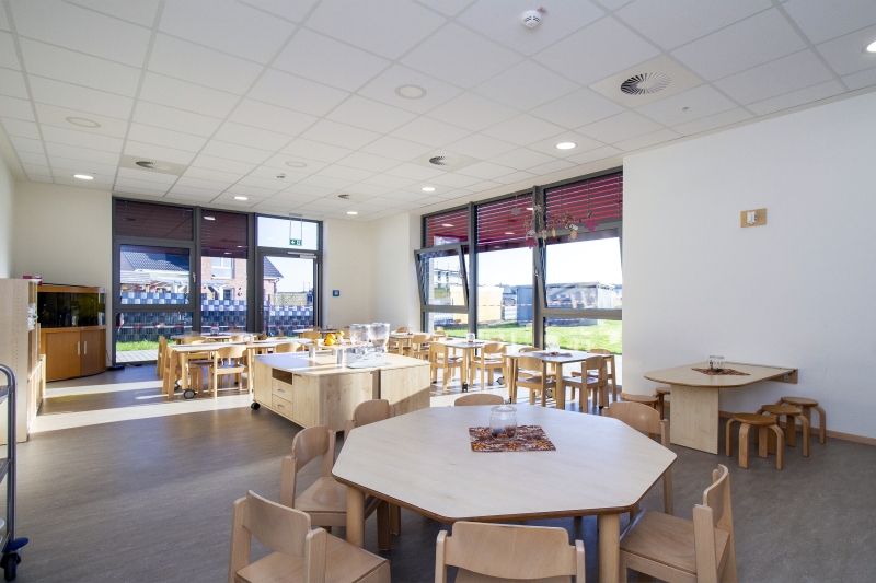 Ein weiterer Faktor des Kita-Konzepts ist die gesunde Ernährung, weshalb im Neubau eine Vollküche realisiert wurde, die von einer Köchin und zwei Hauswirtschaftskräften bewirtschaftet wird. In der angrenzenden Cafeteria nehmen die Kinder morgens ihr Frühstück in Form eines Buffets ein und werden mittags mit frisch zubereiteten Speisen mit einem Schwerpunkt auf regionalen Zutaten verwöhnt.