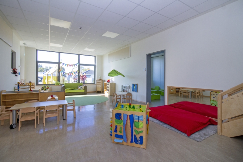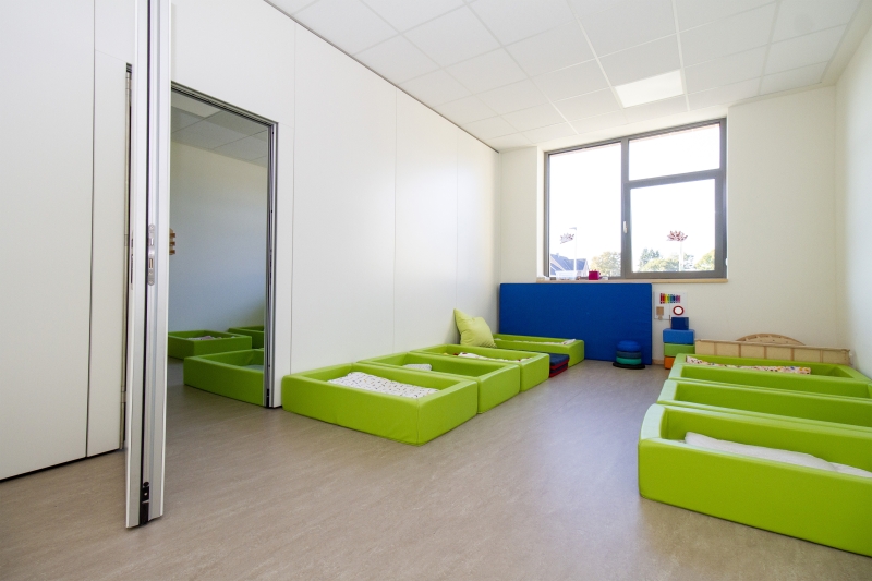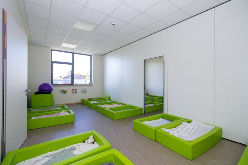 Insgesamt sind in der Kita fünf Gruppen untergebracht, zwei Krippen- und drei Kindergartengruppen. Schon in den Räumlichkeiten der Kleinsten wird deutlich, wie ernst das Bedürfnis nach Bewegung genommen wird, denn die beiden Schlafräume lassen sich miteinander zu einer Fläche verbinden, die für Aktivitäten und Veranstaltungen außerhalb der wohlverdienten Auszeiten stattfinden.