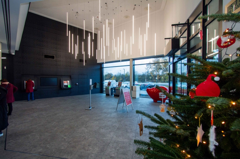 Zeitgemäße Technologie bestimmt auch die haustechnische Ausstattung des Gebäudes, das die Sparkasse auch als Beitrag zum nachhaltigen, klimafreundlichen Bauen versteht. Eine Wärmepumpe nutzt Geothermie und sorgt ohne den Verbrauch fossiler Energieträger im Winter für angenehme Wärme und im Sommer für ebenso angenehme Kühle. Auch Strom zum Verbrauch vor Ort wird in Eigenregie produziert – mit einer Photovoltaik-Anlage, die mit 45-KW-Peak-Leistung erheblich zur Deckung des Bedarfs beiträgt. So lassen sich auch E-Autos an den zwei Ladesäulen nachhaltig auftanken, die auf der Parkfläche mit insgesamt 30 Plätzen zur Verfügung stehen.