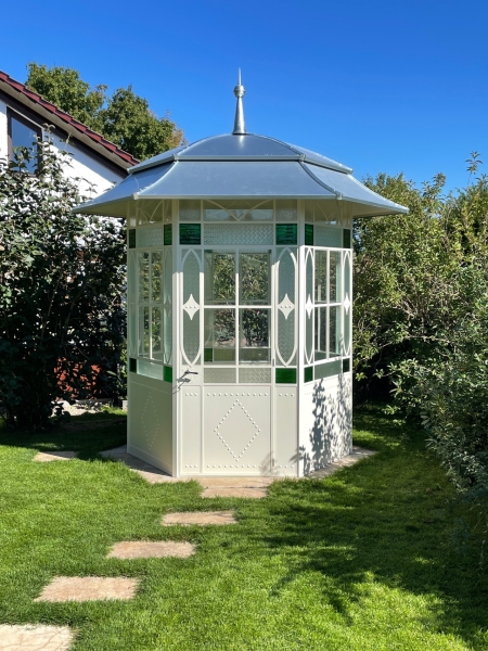 In kunstvoller Handarbeit werden wahlweise offene oder geschlossene Metall-Pavillons im baden-württembergischem Fichtenberg hergestellt. Geschwungene Linien, romantische Ornamente, geometrische Formen und bunte Fenster bringen „die gute alte Zeit“ – inspiriert von Jugendstil und mediterranem Lebensgefühl – in jeden Garten und laden zu erholsamen Auszeiten im Grünen mit dem gewissen Etwas ein. Wenn Kletterrose und Clematis filigran Richtung Himmel wachsen, entsteht z. B. mit einem Rank-Pavillon wie dem Modell Toskana ein Wohlfühlort im Schoße der Natur. Verspielt, lauschig und majestätisch präsentieren sich geschlossene Pavillon-Modelle mit edlen Gläsern. Hier lässt sich ganz originell und bestens geschützt vor Wind und Wetter die nachmittägliche „Teatime“ genießen. Garten & Design arbeitet in der eigenen Manufaktur mit hochwertigem und mundgeblasenem Glas sowie feuerverzinktem und wahlweise pulverbeschichtetem Metall. Sechs, acht oder zehn Ecken, Kugel oder Dachspitze, mit oder ohne wasserfeste Vorhänge: Neben vorgefertigten Modellen, die durch das Baukastenprinzip vielseitig gestaltet und ergänzt werden können, sind auch Sonderanfertigungen möglich, die nach individuellem Wunsch geplant und in allen deutschsprachigen Ländern geliefert und montiert werden.