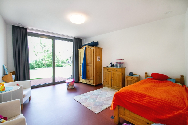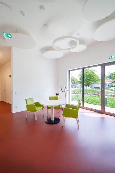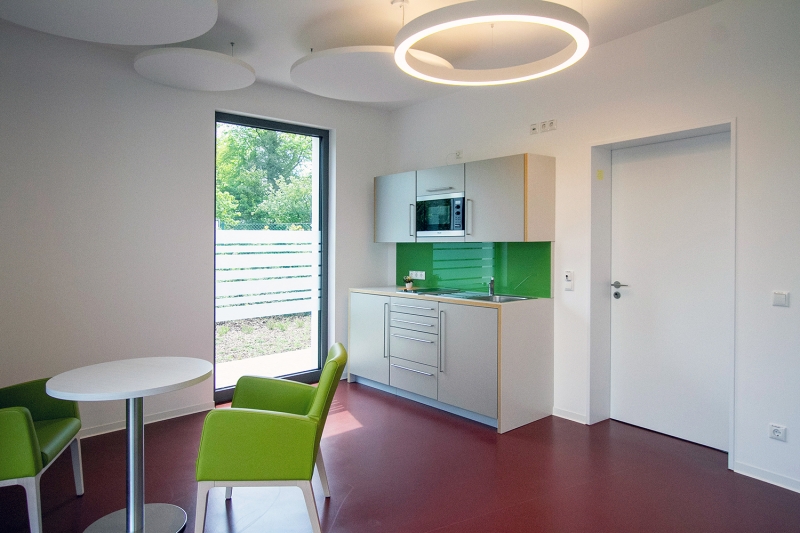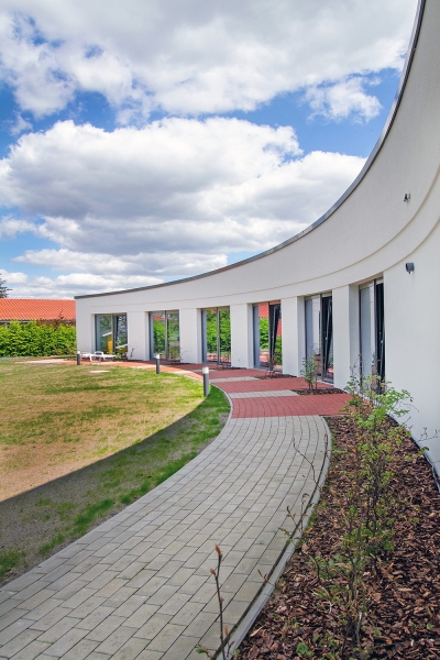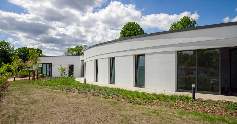 Die 12 Zimmer sind in zwei Kreissegmenten angeordnet, eine Form, die organisch wirkt und Geborgenheit ausstrahlt. Der freundliche Eindruck wird verstärkt durch die Ausrichtung der Räume nach Westen mit entsprechend positiven Tageslichteffekten. Am Berührungspunkt der beiden Kreissegmente ist das Dach des Gebäudes angehoben, um großzügig Raum für die Gemeinschaftsfläche und den Eingangsbereich des Gebäudes zu schaffen.