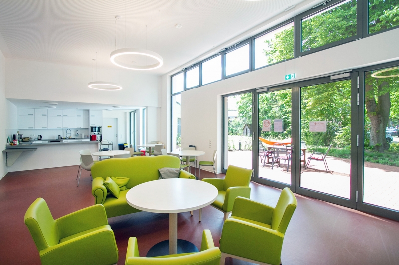 Lichtdurchflutet empfängt der Speisesaal seine Besucherinnen und Besucher, der mit seiner Ausrichtung nach Westen und Süden von den Sonnenständen zu den Hauptmahlzeiten profitiert. Reizvoll ist auch seine Fortsetzung nach draußen auf eine Sonnenterrasse und eine Begegnungsstätte im Freien. Für eine harmonische Verbindung von Innen und Außen sorgen außerdem bodentiefe Fenster, die bei zu intensiver Lichteinstrahlung oder dem Bedürfnis nach Ruhe jederzeit verdunkelt werden können.