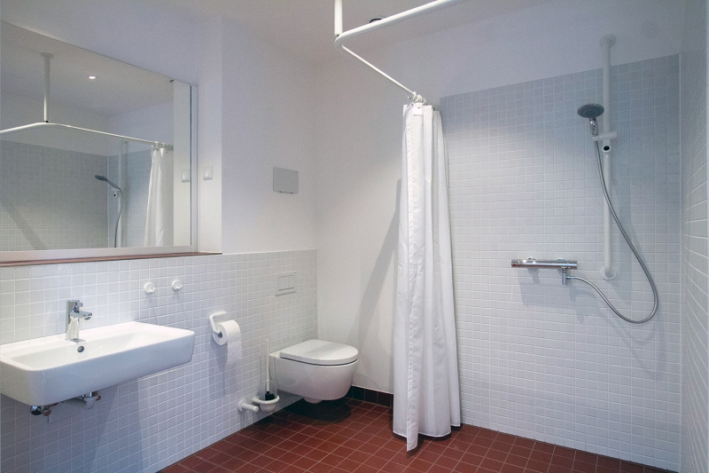 Die Nasszellen sind außerhalb der Zimmer angeordnet, damit diese ihre klare quadratische Form behalten. Außerdem eröffnet diese räumliche Gliederung weitere Chancen zum Rückzug in den Fluren – abschließbare Orte, die ein Höchstmaß an Intimität gewähren.