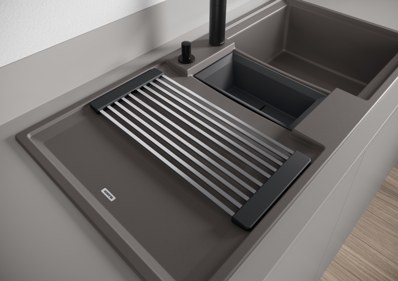 Als kompakte Küchenhelferin erweist sich die im Lieferumfang der Spülenserie „Adira“ enthaltene Klappmatte, die für noch mehr Komfort und Leichtigkeit bei der täglichen Arbeit am Wasserplatz sorgt: egal, ob als zusätzliche Arbeitsebene über dem Becken, als (faltbare) Abtropffläche oder als Untersetzer. Mit der BLANCO Multifunktionsschale wird bei zwei Spülen-Modellen weiteres vielseitiges Zubehör angeboten: Sie kann in das Becken eingehängt werden – etwa zum Sammeln von Schnittabfällen oder zum Abbrausen von Kleinteilen – oder als besonderer Clou in die BLANCO Unterschranksysteme eingesetzt werden. Weitere Infos gibt es unter www.blanco.de.