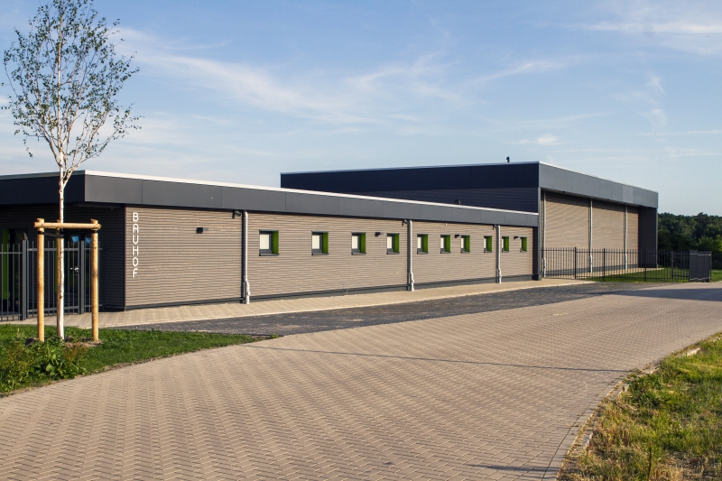 Der Bedarf, den Bauhof neu zu bauen, entstand als Dominoeffekt: Der Platz des Vorgängers wechselt seine Funktion und wird Standort für das neue Rathaus. Für den neuen Bauhof wird ein 10.000 Quadratmeter großes Grundstück im Gewerbegebiet genutzt, auf welchem das Gebäudeensemble aus Massivholz errichtet wurde. Es besteht aus drei geschlossenen Hallen und einem Betriebsgebäude, in dem Büros, Umkleiden mit Waschräumen, ein großer Aufenthaltsraum mit Küchenzeile, Werkstätten und Lagerbereiche sowie ein Pausenraum untergebracht sind. Eine besondere Verbindung von Außen und Innen stellt der überdachte Waschplatz dar, der mit einer beheizbaren Bodenplatte ausgestattet ist, um auch im Winter die Reinigung von Gerätschaften und Fahrzeugen zu ermöglichen.