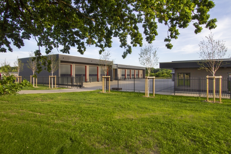 Der industriellen Charakter des Bauensembles und seine Funktion als Fahrzeughalle und Werkstatt wird durch den Einsatz von vorvergrautem Fassadenholz betont. Der in den Leibungen und Stürzen der Hallen verwendete Akzentton Orange spielt auf die Signalfarbe an, die in der Arbeitskleidung der Beschäftigten und den Fahrzeugen wiederzufinden ist. Die farbliche Gestaltung der Innenbereiche des Betriebsgebäudes in Abstufungen von Grün macht die Aspekte des Sozialen und Natürlichen plakativ sichtbar.