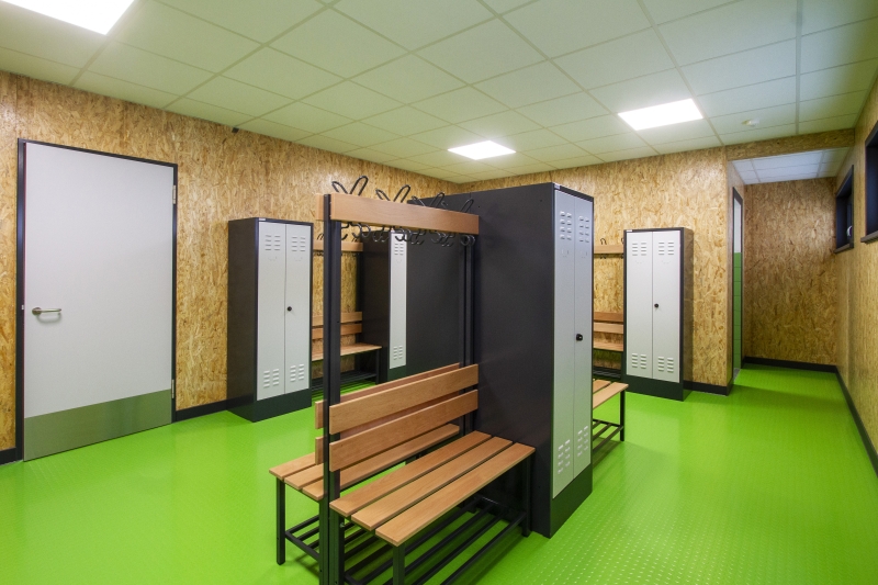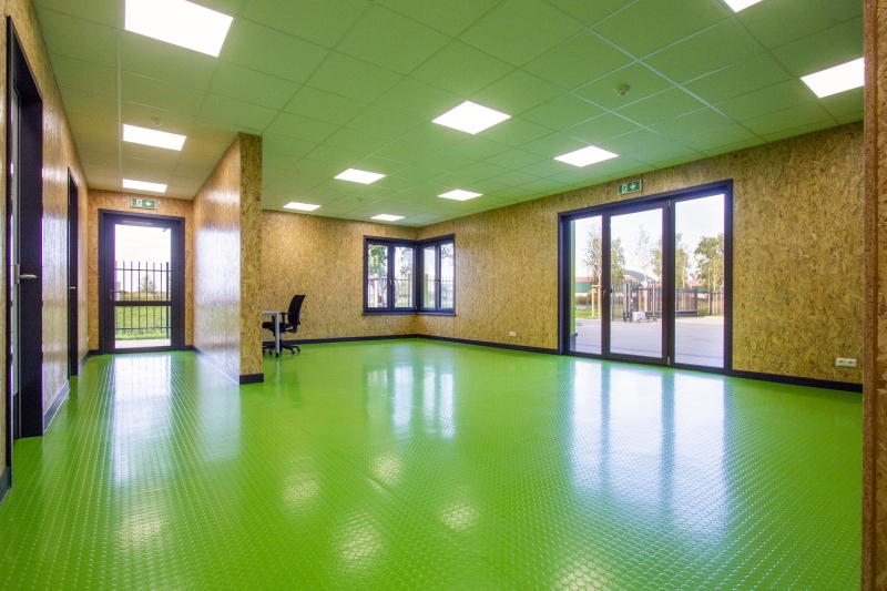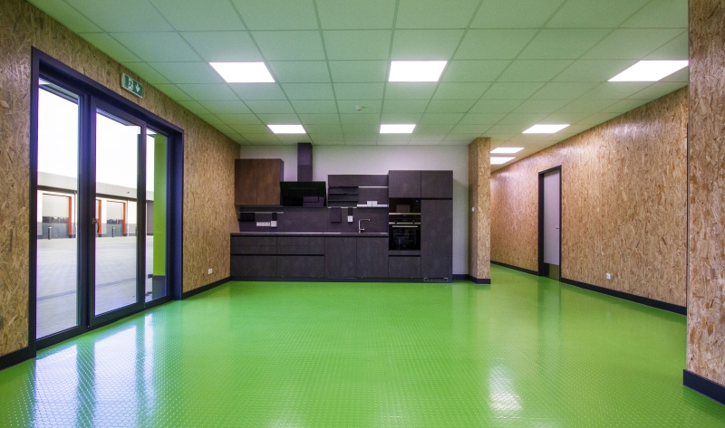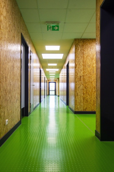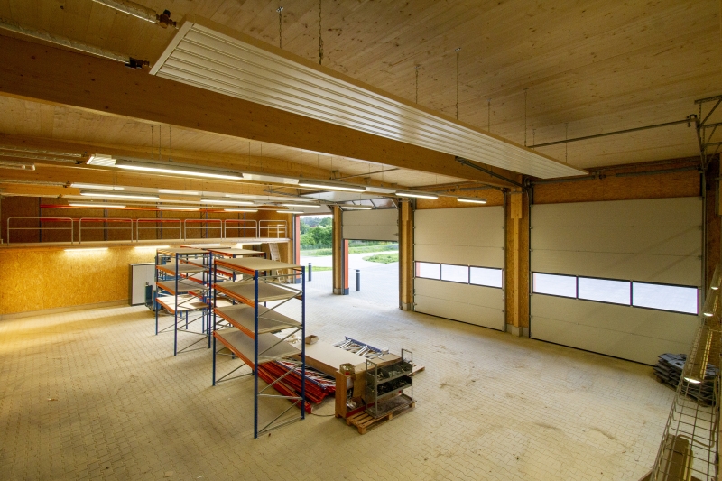 Der Anspruch, mit dem Neubau eine vorteilhafte Ökobilanz zu realisieren, ist über die Bauweise hinaus konsequent zu Ende gedacht worden. Die Gebäudedämmung mit Zellulose greift das Holzthema in recycelter Form auf. Die Heizung der Hallen erfolgt über Deckenstrahlheizkörper und Fernwärme, die in einer benachbarten Biogas-Anlage erzeugt wird.
