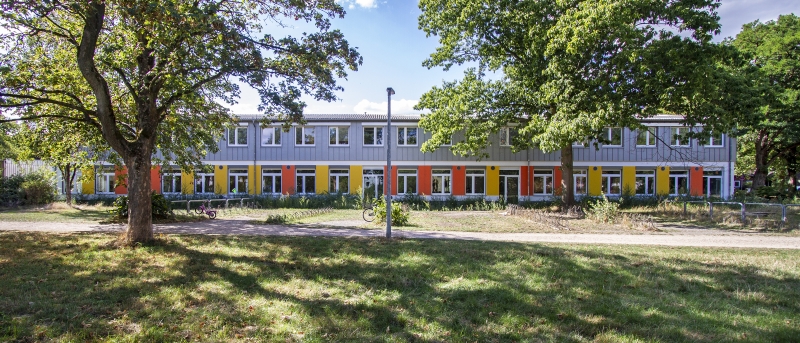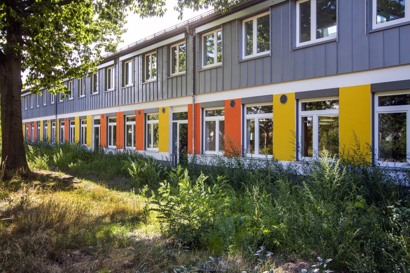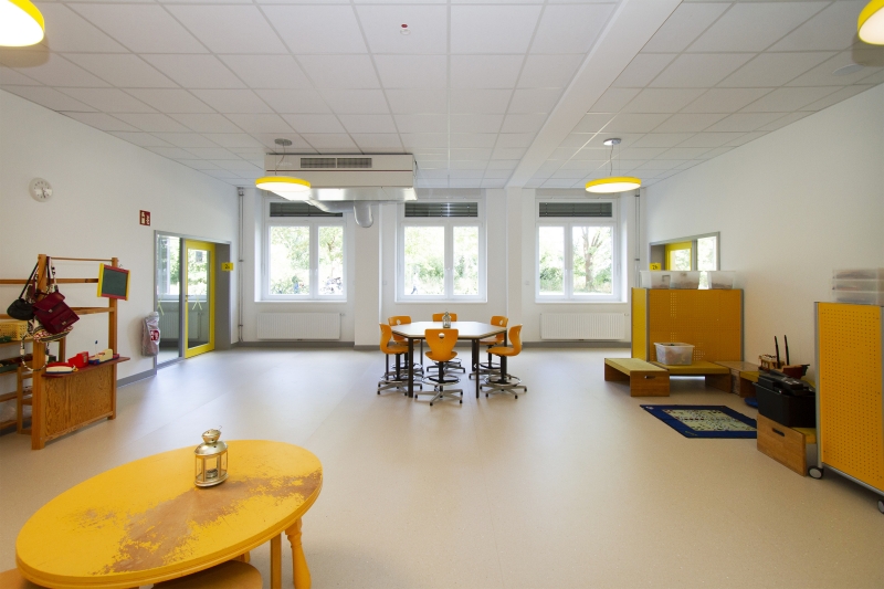 Auch die fröhliche Farbgestaltung unterstützt die Clustergliederung: Rot, Gelb und Grün geben jedem Bereich einen eigenen Ton, erleichtern die Orientierung und schaffen Zugehörigkeit auf den ersten Blick. Doch auch an eine Zusammengehörigkeit über die Cluster hinaus wurde gedacht. Die Tageslicht-reiche, transparente Gestaltung des gesamten Innenbereichs öffnet – beispielsweise durch innenliegende Fenster – Blickachsen von Lerngruppe zu Lerngruppe und sorgt für eine offene, einladende Atmosphäre.