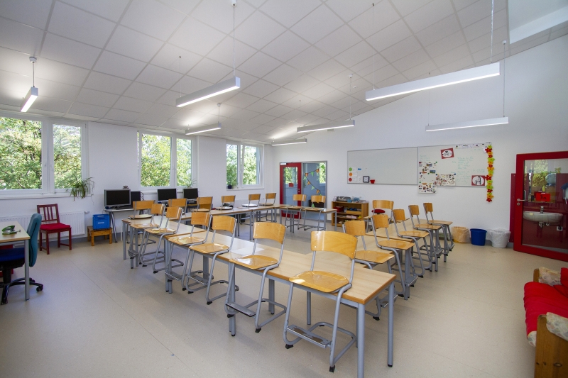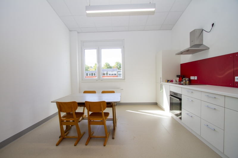 Dass neben dieser übergeordneten Offenheit auch die privateren Sphären der Kinder berücksichtigt wurden, zeigt beispielhaft die neue Mensa mit Ausgabeküche. Hier schaffen mobile Trennwände intimere Räume, sodass jeder Charakter einer „Großraumverköstigung“ vermieden wird. Gleichzeitig bieten die Wände die Möglichkeit, den Raum als eine Fläche zu öffnen und für Elternabende oder Veranstaltungen zu dienen, bei denen sogar der angrenzende Musikraum hinzugezogen werden kann.