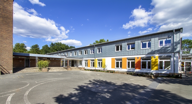 Die entstandenen Räumlichkeiten fügen sich perfekt diesen Vorgaben und lassen die Idee eines Konzepts zum dreidimensionalen Erlebnis für Schulkinder und Lehrkräfte werden. Dem Grundgedanken des Clusters wird durch die Strukturierung der Fläche Rechnung getragen. Umgesetzt wurden drei Raumensembles, die jeweils ein Cluster repräsentieren. Es beinhaltet vier Klassenzimmer, einen Multifunkitonsraum und einen kleinen Raum, der beispielsweise für sonderpädagogische Förderung zur Verfügung steht. Die Räume gliedern sich um ein sogenanntes „Mini-Forum“, einem Ort, in dem sich die Kinder des jeweiligen Clusters über ihre Klassenverbände hinaus begegnen und Projekte in Kleingruppen realisieren können.