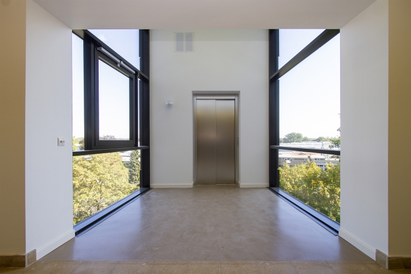 Die Ergänzung des Gebäudes um den erwähnten vierten Zacken hat ihre Ursache in der neuen Fahrstuhlanlage, die nicht nur die Wohnqualität in den 15 Wohneinheiten steigert, sondern in Kombination mit einer Außenrampe auch einen barrierearmen Zugang ermöglicht.