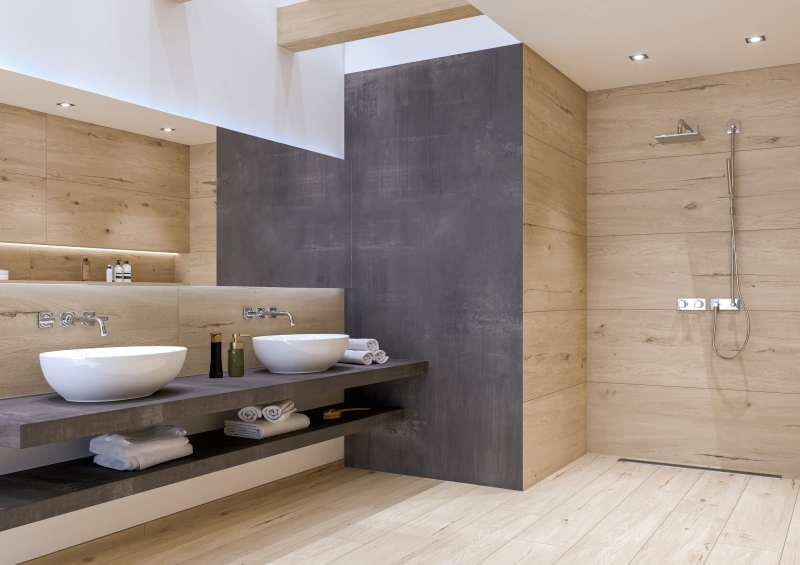 Auch bei den unvermeidlichen Putzarbeiten im Bad bewähren sich Wand- und Bodenfliesen, denn sie sind absolut wasserfest und mit einem normalen Haushaltsreiniger sauber zu halten. Besonders günstig sind XXL-Fliesen, die der Profihandwerker mit minimalen Fugenbreiten verlegt. So kann sich in den Fugen kaum mehr Schmutz festsetzen. Eine perfekte Ergänzung in puncto Ästhetik und Reinigung sind WC-Keramiken ohne Spülrand und mit glatter Außenkontur sowie leicht zu reinigende Waschtische mit Wandarmaturen.