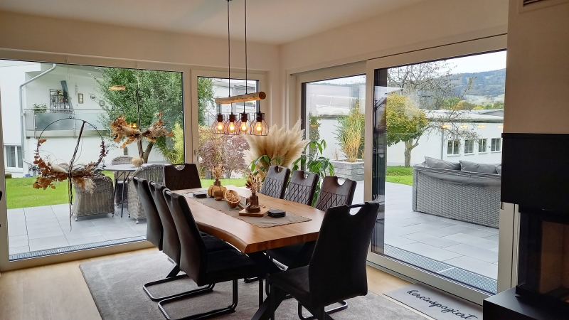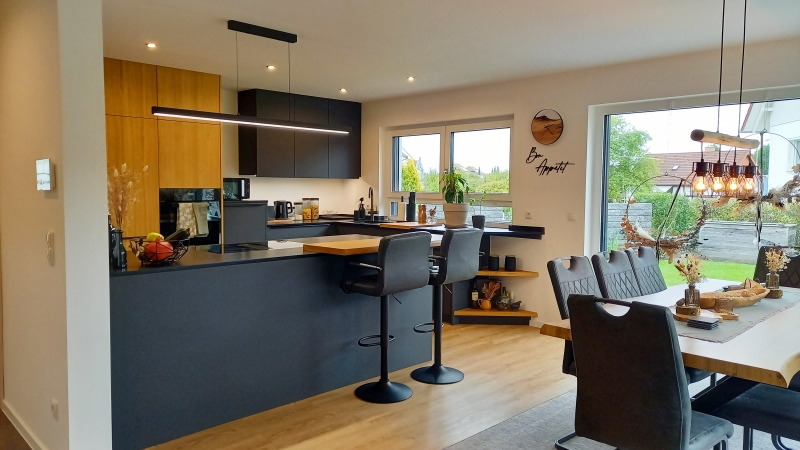 Schon von Beginn an stand fest, dass das neue Zuhause stilvolle Wohnqualität mit praktischer Funktionalität vereinen soll. Bereits in der Planungsphase wurde jedes Detail durchdacht: vom großzügigen Wohn-Essbereich mit offener Küche und separatem Abstellraum über ein Homeoffice sowie ein Fotostudio im Keller bis hin zum luxuriösen Elternschlafzimmer mit Ankleide – sogar die Möbel wurden von vornherein berücksichtigt. Harmonische Bodenübergänge, ein elektrischer Türspion und eine pflegleichte Treppe rundeten den detaillierten Entwurf ab. Zukunftssicher und flexibel: Die Haustechnik entspricht nicht nur den aktuellen Standards, sondern bietet auch die Möglichkeit zum Nachrüsten.