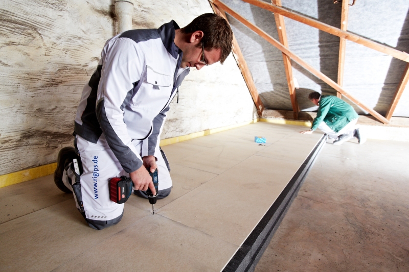 Gerade über ungedämmte Dächer verlieren ältere Wohnhäuser im Winter wertvolle Wärmeenergie und vergeuden so unnötig natürliche Ressourcen. Genug gute Gründe also, in die energetische Qualität des eigenen Zuhauses zu investieren. Besonders schnell, einfach und wirtschaftlich lässt sich die Energiebilanz eines Gebäudes mit der Dämmung der obersten Geschossdecke realisieren – ohne viel Baustellenschmutz und -lärm. Mit überschaubaren Kosten und vergleichsweise geringem Aufwand bleiben die Energiekosten auch in Zukunft beherrschbar. Darüber hinaus steigt durch die energetische Ertüchtigung auch der Wert der Immobilie. Das verlegefreundliche Rigidur Dachbodenelement 032 TF von RIGIPS sorgt unabhängig von der Beschaffenheit der Geschossdecke für eine sofortige Energieeinsparung. Die handlichen Elemente (500 x 1.500 mm) bestehen aus einer hoch wärmedämmenden, graphit-veredelten EPS-Dämmlage und einer robusten Oberlage aus Gipsfaserplatten. Vollflächig verlegt, reduzieren sie den Wärmeverlust über den Dachboden um bis zu 90 Prozent und sorgen für ein behagliches Raumklima in den Räumen darunter. Die Rigidur Dachbodenelemente 032 TF bieten dabei größtmögliche Flexibilität in der Verarbeitung und der weiteren Nutzung der mit ihnen gedämmten Flächen: Je nach Untergrund und Beanspruchung können die Dämmelemente lose nebeneinander verlegt oder zusätzlich verklebt und verschraubt werden. Der spezielle Treppenfalz garantiert eine geschlossene, wärmebrückenfreie Verlegung. Dank der harten Rigidur Gipsfaserplatten sind die gedämmten Flächen sofort begehbar und das Dachgeschoss kann zur Lagerung leichterer Gegenstände genutzt werden.
