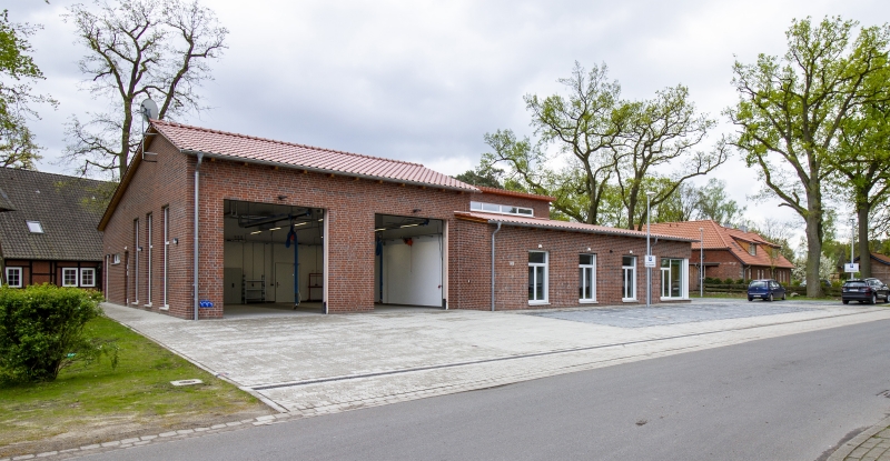 Doch warum überhaupt neu bauen? Die Antwort fällt nicht sehr schwer: Der bestehende Standort war zunehmend mit der Herausforderung verbunden zu improvisieren. Die Feierwehr war im Dorfgemeinschaftshaus untergebracht, dem historischen Hirtenhaus, das für Personal und Fahrzeuge zu wenig Platz bot. Ein Problem, das sich aus gutem Grund sogar zuspitzte: Die Technik, die zum Einsatz kommt, wächst buchstäblich, sodass ihr Platzbedarf steigt. In Jeversen führte dieser Umstand zu der unbequemen Notwendigkeit, die Fahrzeuge aus der Halle herausfahren zu müssen, um ausreichend Freiraum fürs Umziehen zu haben.